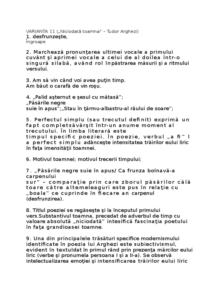 Barem Simulare Bac Romană 2019 Toamnă De Suflet De Tudor Arghezi