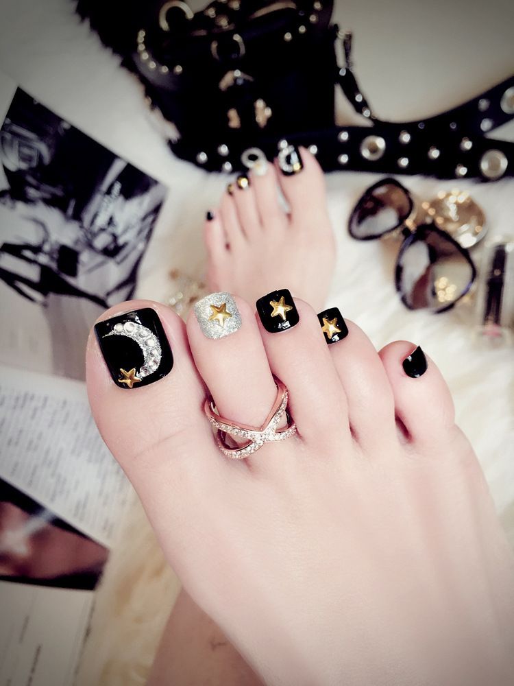 Amazon Com Campsis Fashion Glossy Fake Toenails Silver Glitter Black Short Press On Nails Acrylic Clip On False Toe Nails For Women And Girls Pack Of 24 Beauty