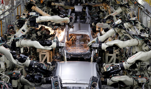 Robots Weld Bodyshells Of Toyota Motor Corp S Prius Hybrid Car On The Assembly Line At The Tsutsumi Plant In Toyota Buy This Stock Photo And Explore Similar Images At Adobe Stock