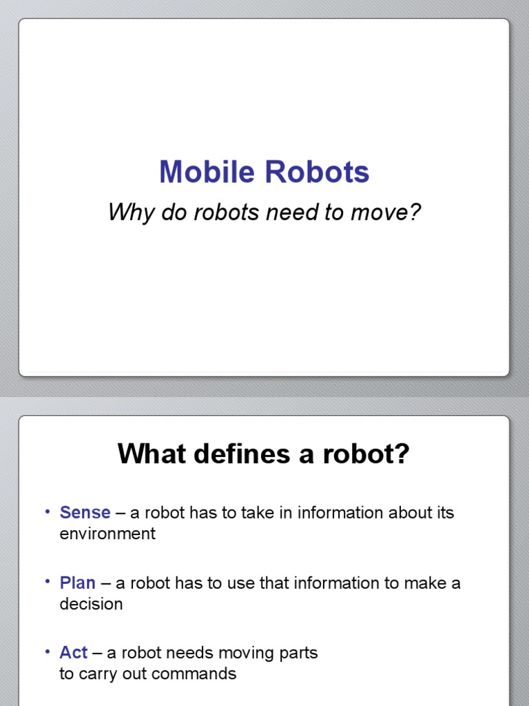 Mobile Robots Why Do Robots Need To Move What Defines A Robot Sense A Robot Has To Take In Information About Its Environment Plan A Robot Has To Ppt Download