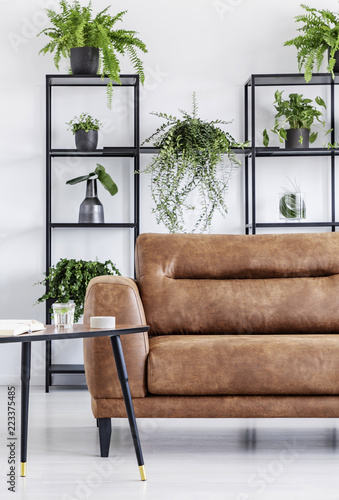 Plants On Shelves In White Modern Living Room Interior With Table Next To Leather Sofa Real Photo Buy This Stock Photo And Explore Similar Images At Adobe Stock Adobe Stock